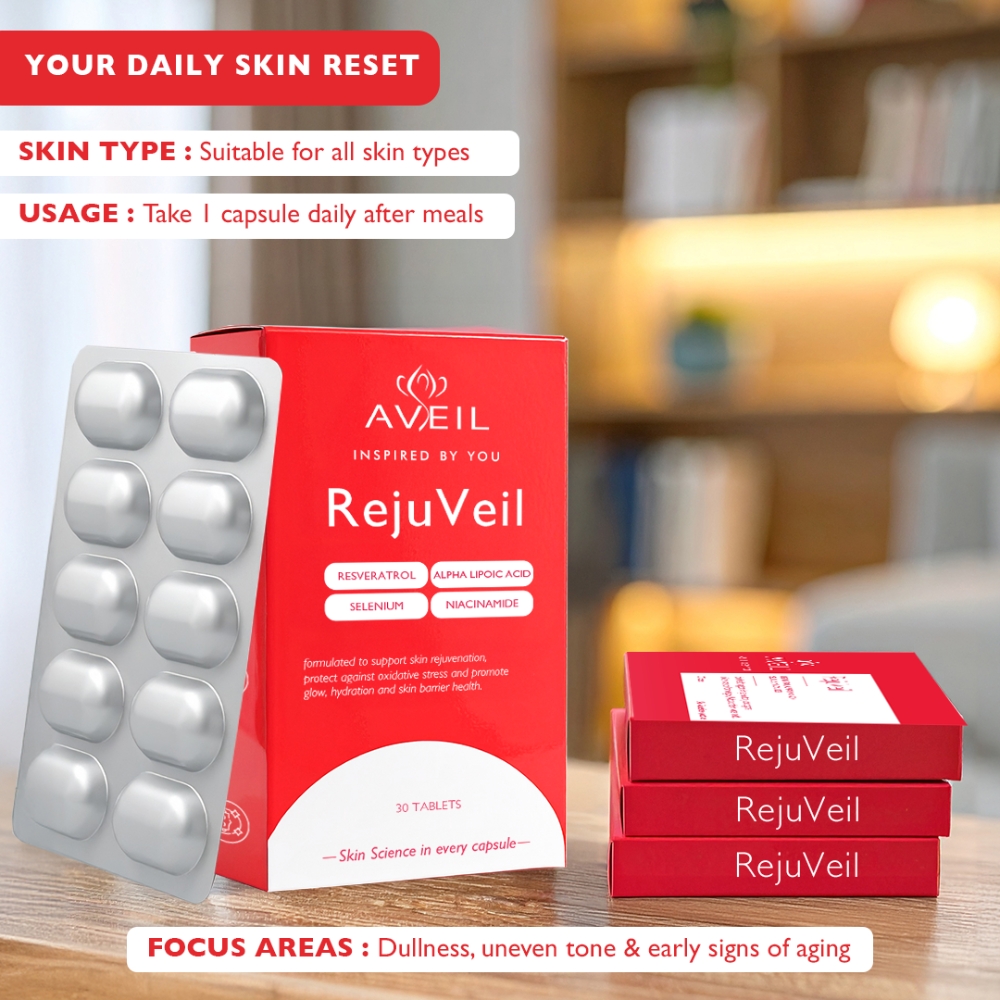 (Inclusive of all taxes)Aveil Rejuveil is an advanced antioxidant and cellular defence supplement, designed to bring back youthful radiance while supporting skin, hair, and overall wellness. Powered by a unique blend of Resveratrol, Alpha Lipoic Acid, Niacinamide, Vitamin C, Vitamin E, Zinc, Biotin, Vitamin B12, Folic Acid, and Selenium, it provides comprehensive protection against everyday damage and helps the skin renew from within.